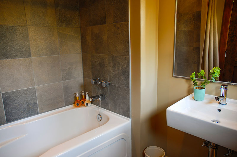 The master bedroom is located on the chalet’s top floor. This room has a king-sized bed which can also be set up as two singles if needed, and an ensuite bathroom with a bathtub and shower.