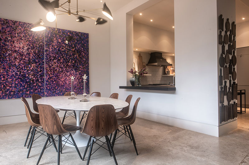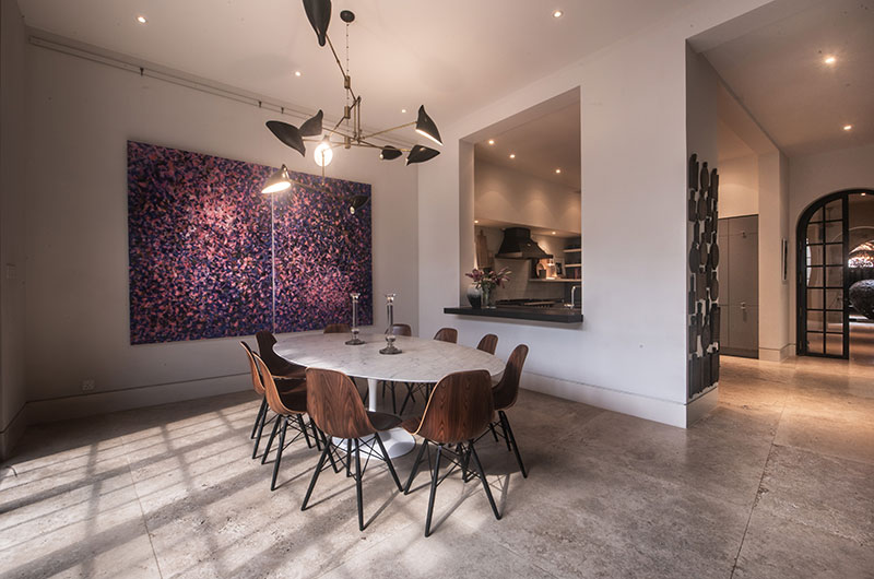 Surrounded by historic grandeur and age-old heritage, the dining room feels strikingly modern. This luminous space features a round marble top dining table surrounded by eight designer chairs, with modern works of art framing this elegant space. The dining area extends to a modern open-plan kitchen.