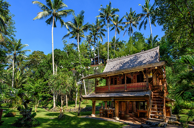 The eight bedroom is housed in the Blora House, above the villa’s Bulldog Bar and cinema room. The room has a king-sized bed, a TV and an ensuite bathroom with a rock bathtub and a shower. The room has a private balcony with rice paddy views.