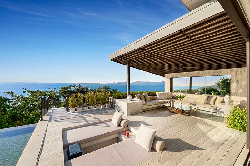 Raku Samui is a spacious five-bedroom villa built on a scenic hilltop. The villa includes an open-plan living and dining room and a 16-metre swimming pool.