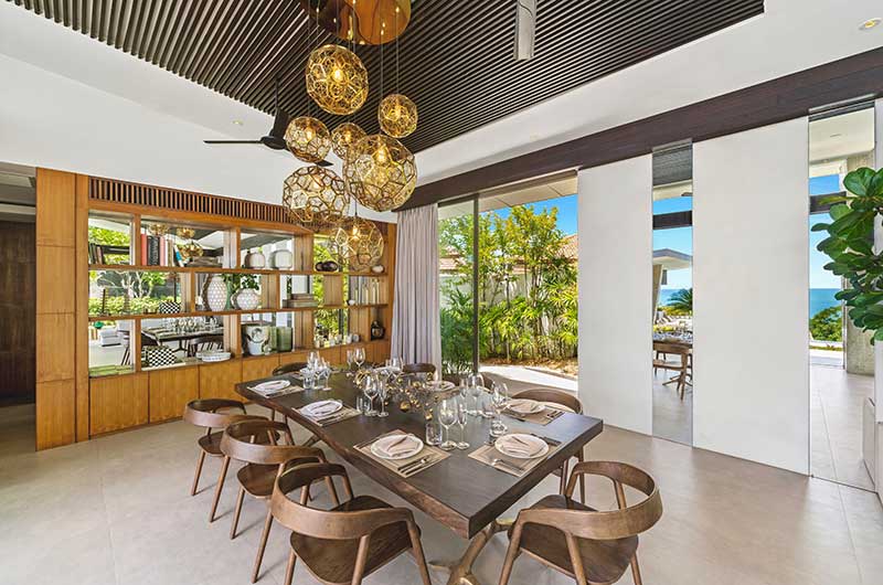 The indoor acacia wood dining table can seat up to eight guests and offers views of the pool and ocean. The villa includes a fully equipped kitchen.