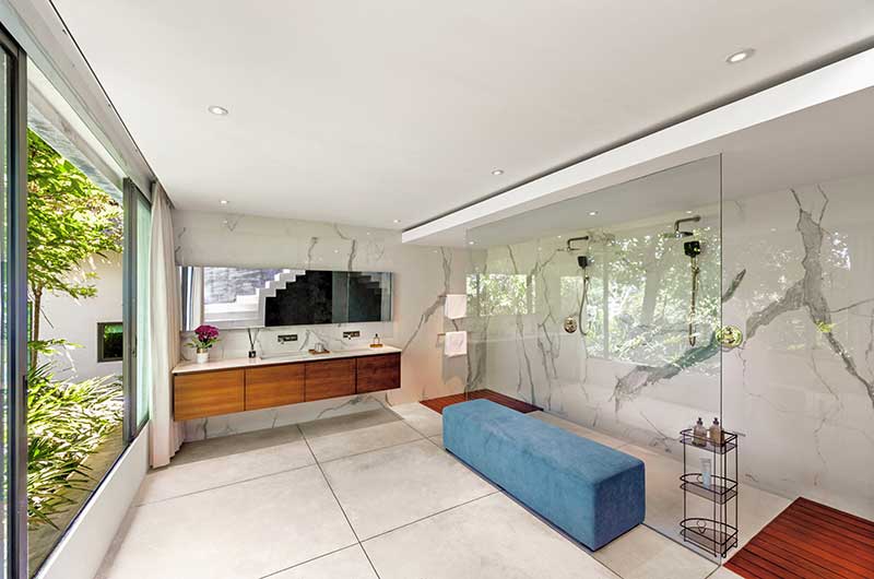 The fourth bedroom has a king-sized bed and an ensuite bathroom with marble floors and gold-pleated fittings.