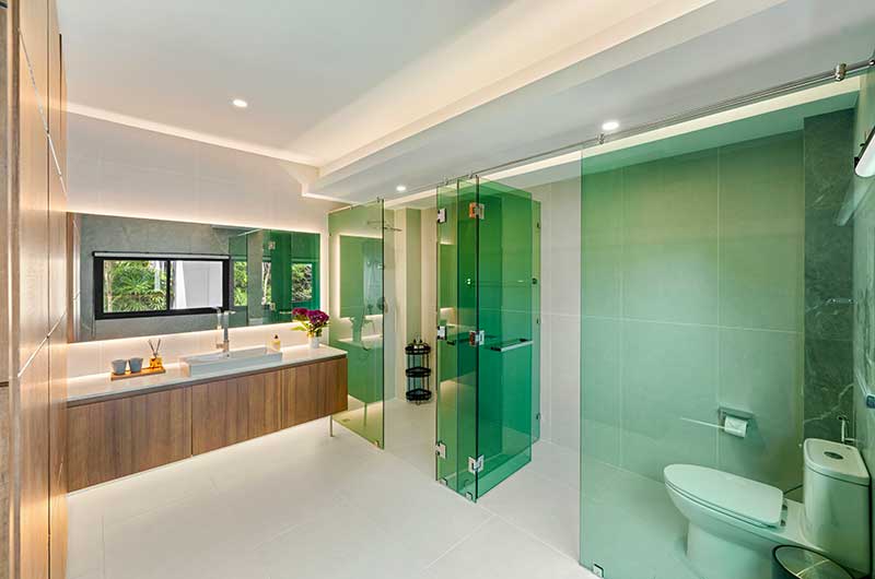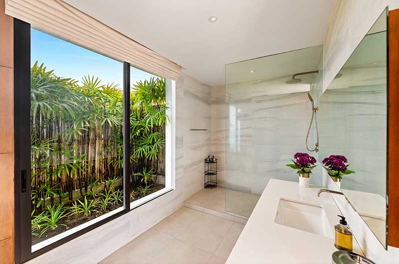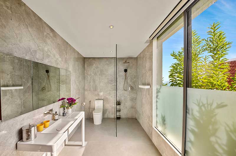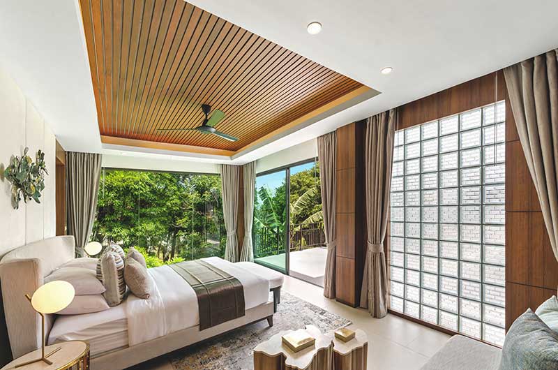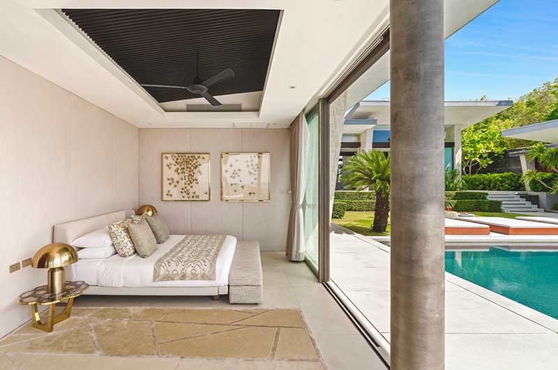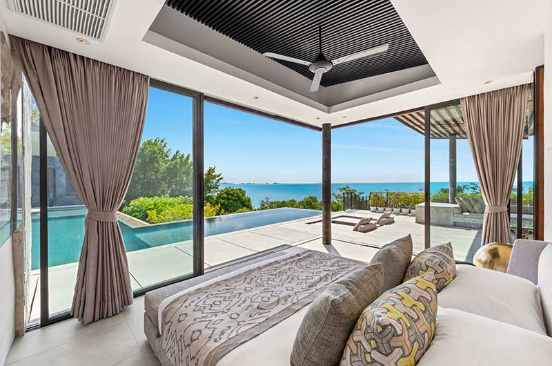 The master bedroom has a king-sized bed and offers views of the ocean and over to Koh Phangan. The master bathroom has floor-to-ceiling windows and a double shower with 24-carat gold pleated faucets.