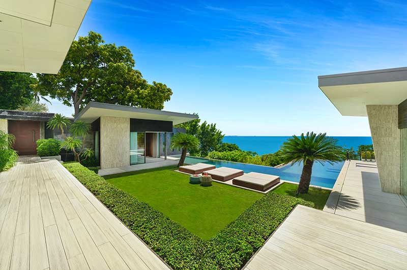 The villa has an L-shaped infinity pool measuring at 16 x 10 metres. There are sun beds and parasols by the pool. For a place in the shade, retreat to the outdoor sala with sunken lounge seating with Jim Thompson designer fabrics.