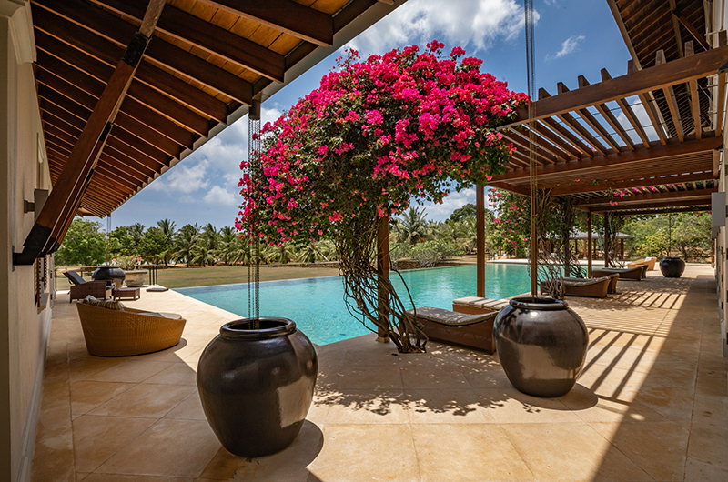 There is an entertainment room with a full wall screen projector; a well stocked library, a ping pong table which provoked much noise and excitement, the gardens full of wild life including peacocks, lizards, iguanas, tropical birds and two friendly resident dogs who live on the perimeter of the 23 acre estate. The long pristine beach is deserted and we walked there everyday. The pool is 33 metres long and is central to the villa where we spent most of our time – brilliant fun. The garden is huge in front of the pool and great for cricket , rounders and other games.