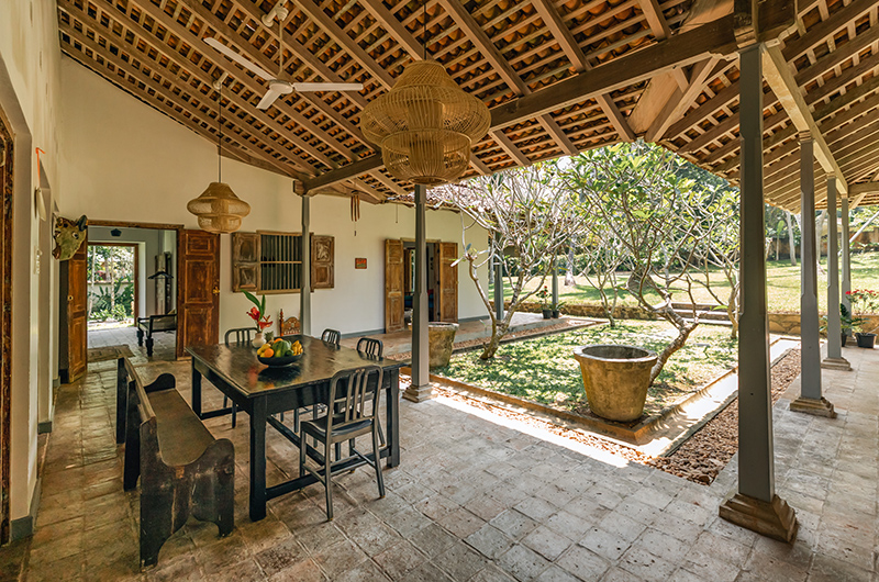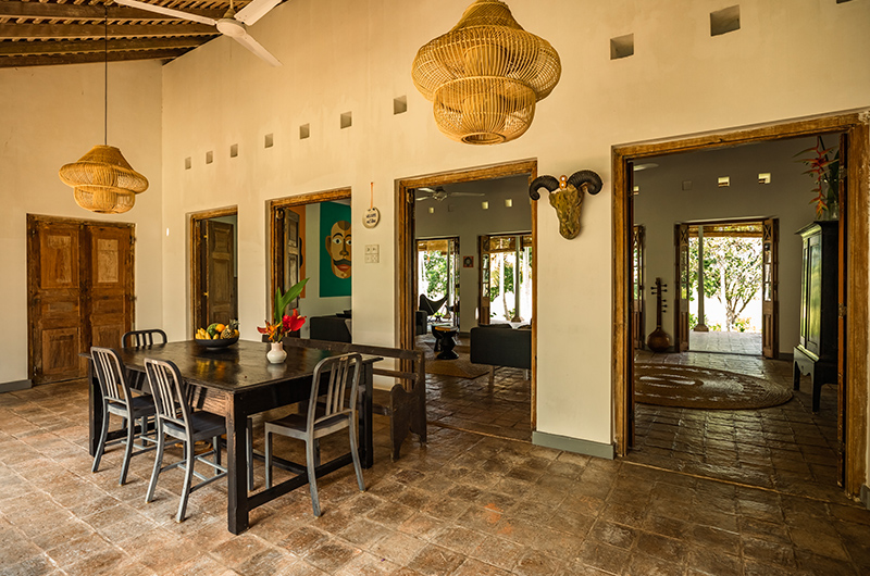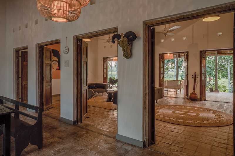 The living room takes pride of place at the heart of the villa, flanked by a breezy furnished veranda on either side. With tiled floors and a sky-high ceiling elevated with king trusses, the room exudes a historic ambiance that’s further enhanced with antique doors and windows. The furniture by contrast is refreshingly modern, with two sleek grey sofas framed by striking contemporary paintings adorning the walls. The setup feels steeped in history yet very of-the-moment.