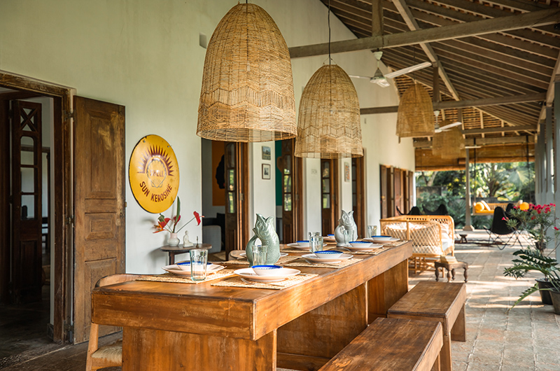 The villa’s sturdy solid wood dining table is positioned outside on the veranda, providing picture-perfect views of the rice paddies as you dine. The dining table is surrounded by benches and dining chairs and can easily accommodate the whole group. Behind the dining area, doors open to a well-appointed and beautifully styled kitchen which is fitted with all the culinary essentials. Need more options? There is another dining area on the second veranda, this one looking over a lovely courtyard.