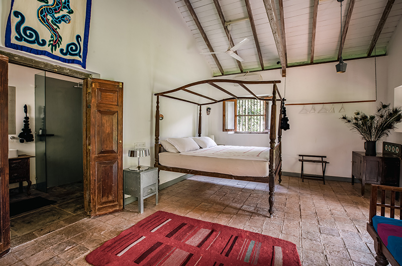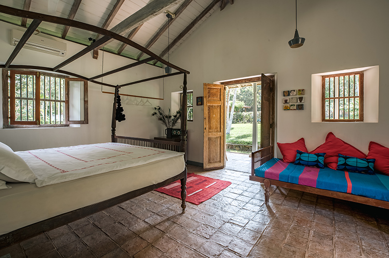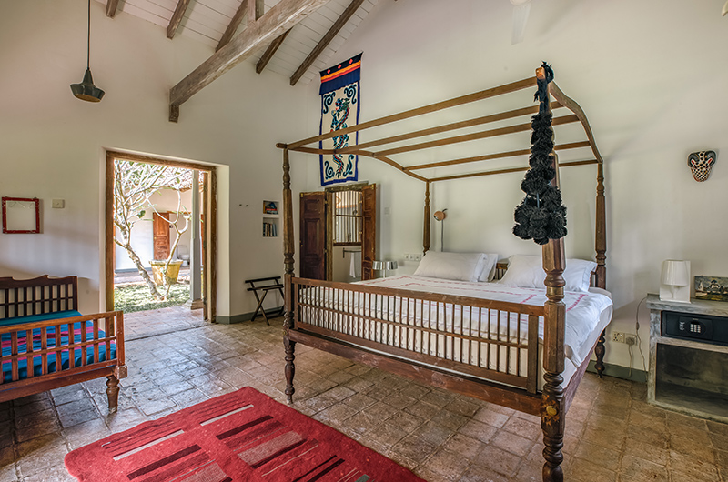 The second bedroom also features a king-sized four-poster bed and a sofa bed. A door on one side of the room opens to the central courtyard, while another provides access to the garden lawns. The adjoining bathroom is fitted with a shower, vanity and toilet.