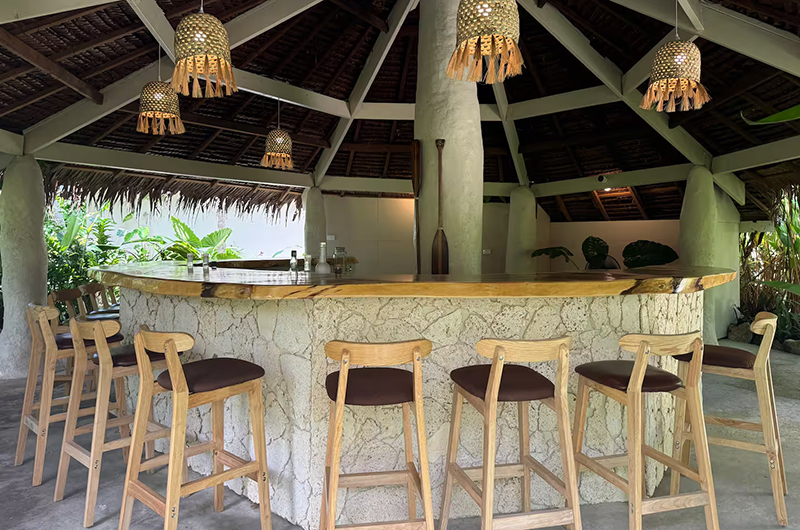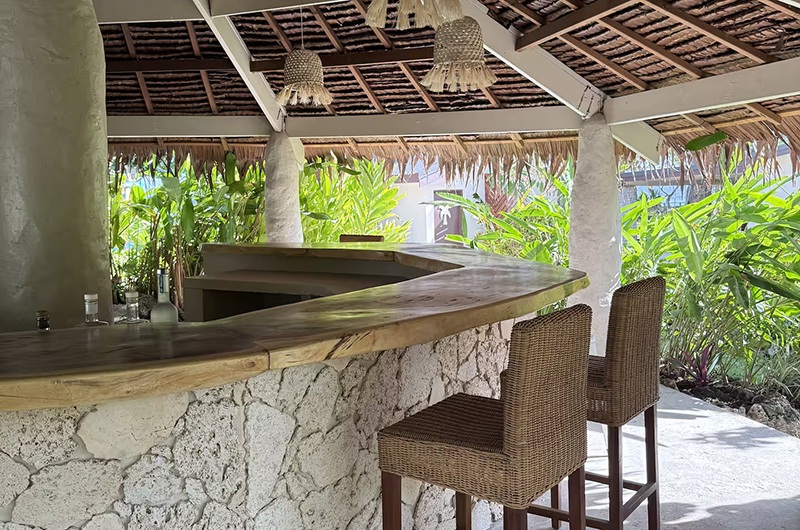The villa’s main building features two beautifully appointed bedrooms and two modern bathrooms. Flanking the main building are three private bungalows, each boasting an ensuite bedroom and ocean views. These individual sanctuaries provide the ultimate in privacy and relaxation, ideal for multi-generational groups or those traveling with friends.