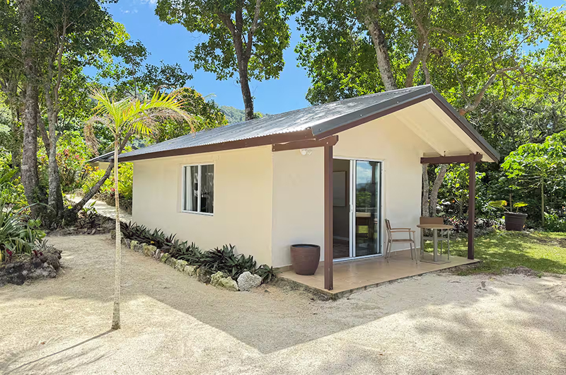 The first bungalow is closest to the main building and has a queen-sized bed, views of the ocean, and an ensuite bathroom with a shower.