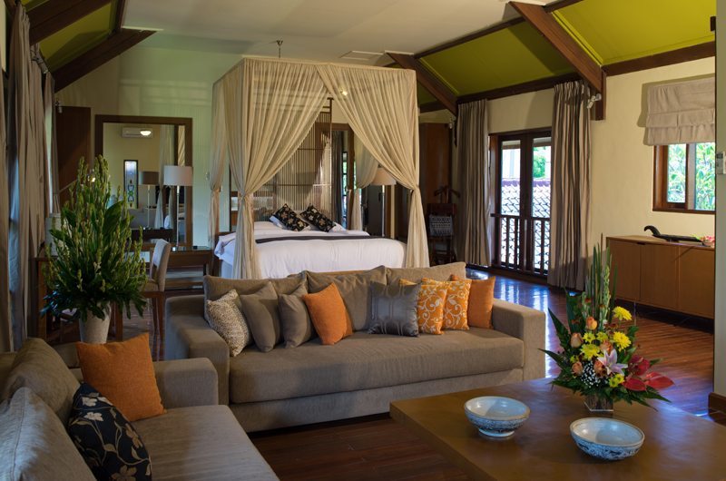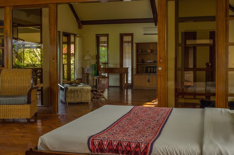 Walk across a little bridge that sits over the fish ponds to the pavilion that houses two master suites. These suites both have the authentic high thatched roofs, and windows that open to the pool or garden. The master suites feature king size beds and sofas where you can sit to catch the latest movie on the TV. The ensuite bathrooms are open air and boast sunken bathtubs. There is also a rain-shower that hangs from the ceiling.