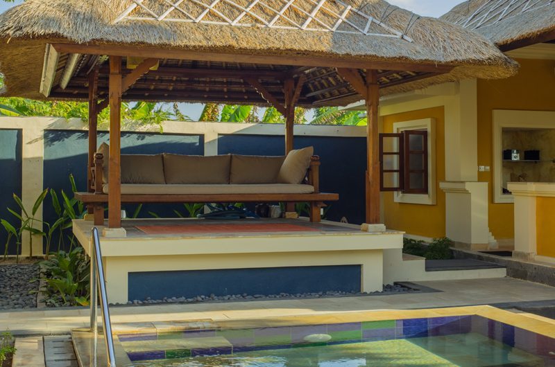 The exotic plants and frangipani trees in the garden represent quintessential Bali. The 10 x 5m infinity swimming pool is tiled with natural stones and features a built-in sofa for you to relax before completing more laps. There is also a thatched roofed gazebo next to the pool to lounge and relax.
