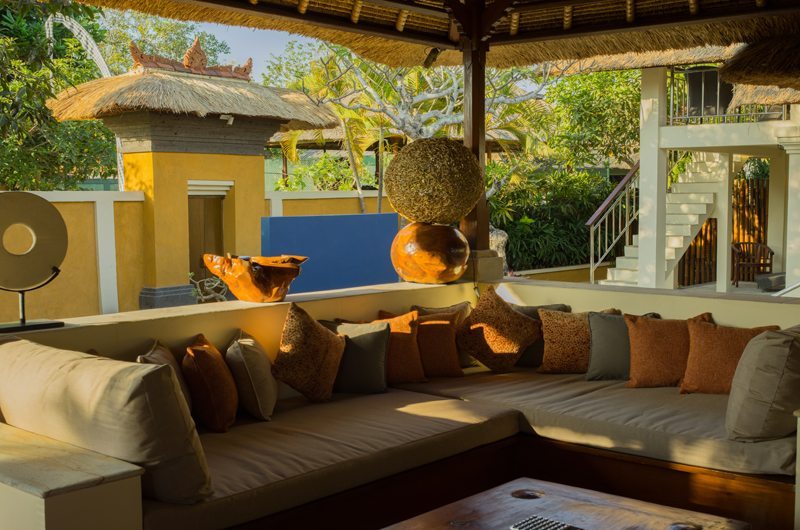 The open concept living area has marble flooring and is bounded by a thatched roof overhead. There is a large comfy couch area where you can relax and look out to the tropical garden, and dinner can be served at the inviting dinner table that resembles an old traditional boat and sits six.