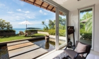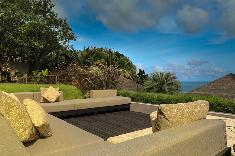 Sangsuri Villa 1 has an open-plan lounge, dining space and double kitchen, all fronted by wood and glass doors that open onto a lawned terrace and generous seaview pool. the dining area has two dining tables that provide mealtime seating for up to 16 people. A resort style kitchen, breakfast area, built-in barbecue and covered, furnished relaxation sala – plus a separate guest bathroom – not only make this space an indulgent private lounge, but also an ideal venue for entertaining guests.