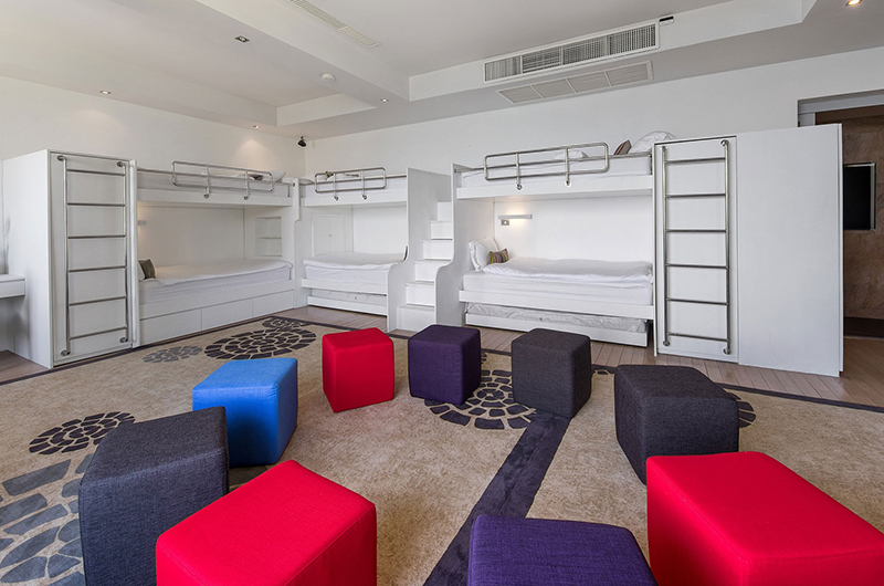 The nineth bedroom has three bunk beds and an ensuite bathroom with a shower.