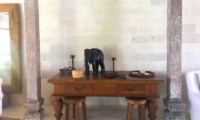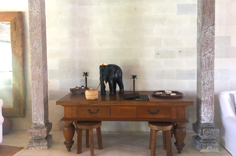 The living room is a light and airy space furnished with pillowy arm chairs and relaxed bean bags, with a flatscreen TV offering a bit of in-villa entertainment. Cool tiled floors and a full-length mirror make this a great space for practicing yoga, with palm tree pillows and tropical knick knacks adding to the bohemian feel.