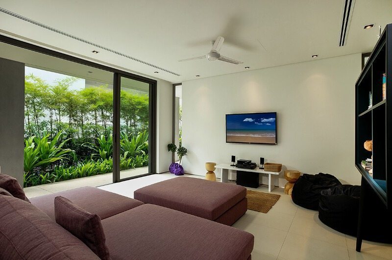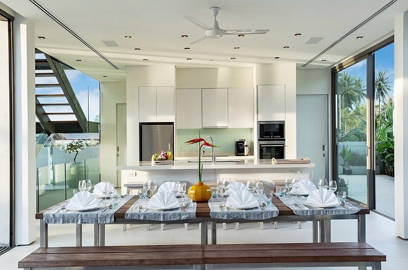 The light and bright living room houses a white sofa directly overlooking the pool. The media room has a sofa, bean bags and a home theatre system. The dining room offers a dining table for up to 14 guests and a well-equipped kitchen.