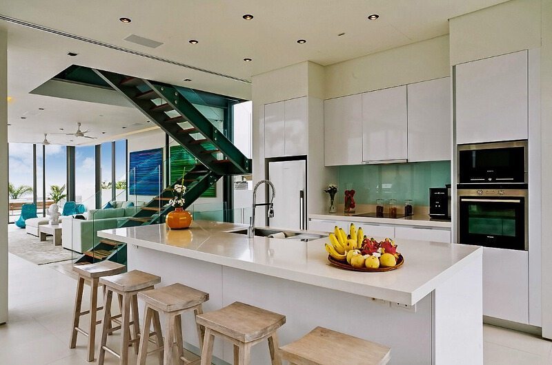 The living room opens out to the swimming pool and offers views of the ocean. There’s also a separate TV room with comfortable seating, flatscreen TV and foosball table. The villa has an eight-seater dining table and a well-equipped kitchen.