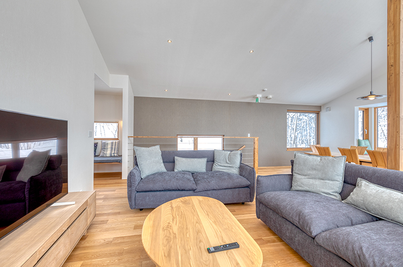 The living room is located on the chalet’s upper floor, surrounded by windows looking out to the snow covered woods. The living room features plush grey sofas and a cosy nest chair, with a huge TV with Apple TV and Netflix offering entertainment after a day of skiing.