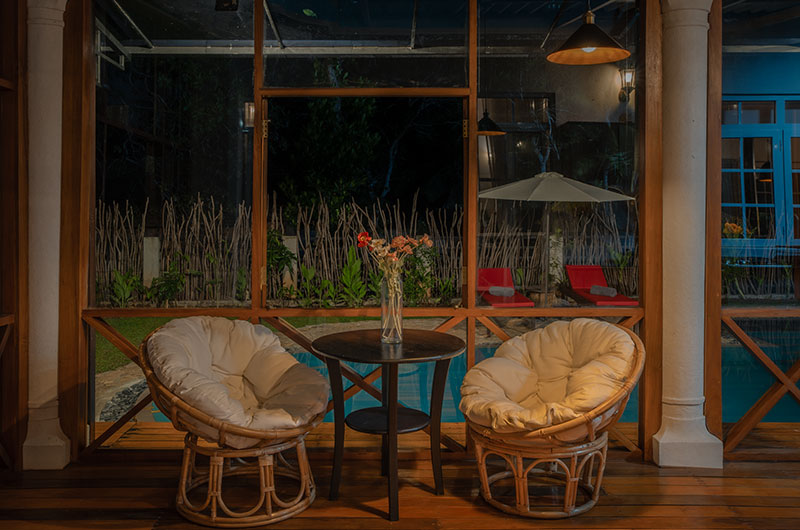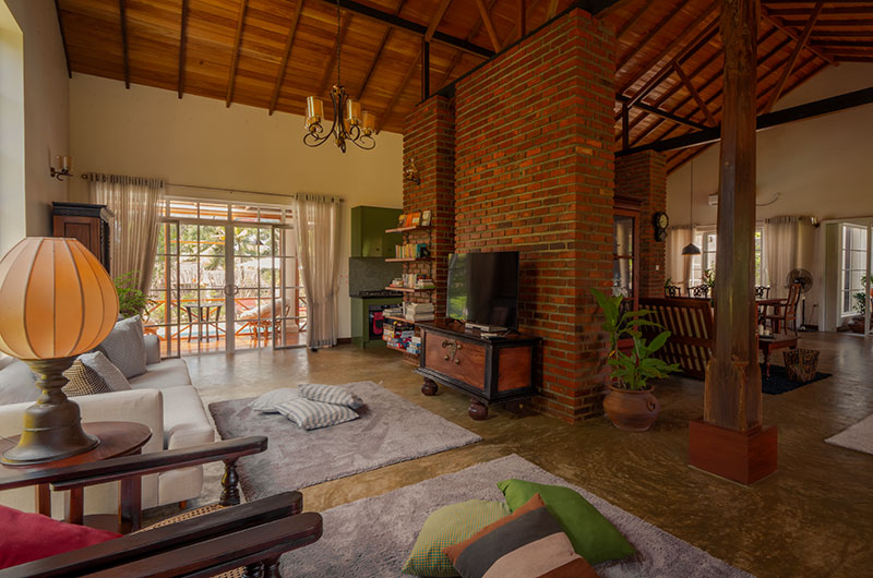 Sevena Villa is an idyllic tropical hideaway. The villa is surrounded by tropical greenery on all sides. Extensive lawns and a gorgeous private pool make it very easy to enjoy the great outdoors to the fullest. With its earthy colour scheme and beautifully curated furniture, the villa has a timeless feel to it. Exposed brick walls, polished floors, and unabashedly plush sofas and fluffy carpets add a modern twist that’s pretty irresistible.
