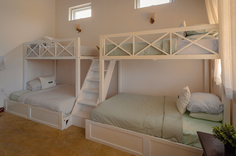 This room features two sets of bunk beds with double beds on the bottom and single beds on top. The room also has a flatscreen TV and a collection of board games. All in all, the setup is ideal for hosting a slumber party.