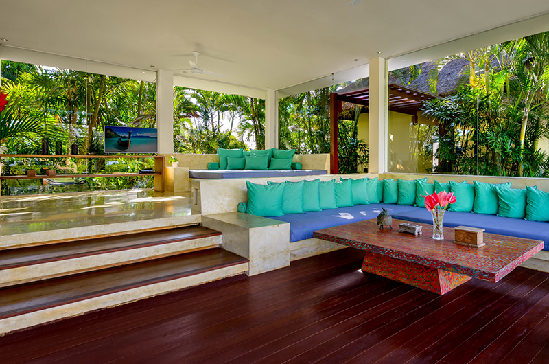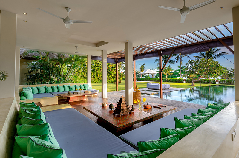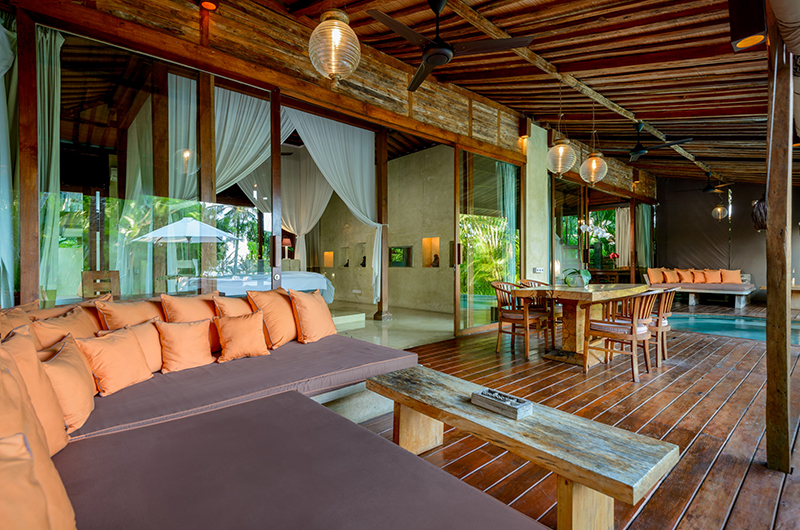 Shalimar Makanda is a 4 bedroom villa, enormous in size to ensure that guests have plenty of space to relax without compromising on privacy. The villa can sleep 8 guests in 4 king size beds with en-suite bathrooms with 4 bath tub and 4 showers. Master bedrooms are located in stand alone pavilions whereas two others are positioned on the upper floor of the main living pavilion. The huge four poster beds with ceiling hung nets and mood lighting create a romantic ambience within the bedrooms. The folding glass doors offer majestic views of the surrounding beauty. The ground floor bedrooms have semi open-air bathrooms with showers and a large bathtub. The upstairs bathrooms have a shower and offer uninterrupted views of the ocean and rice paddies from their bathtub.