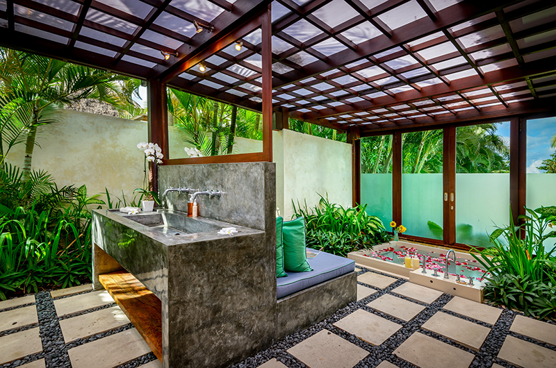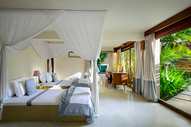Shalimar Cantik is a 2 bedroom villa. The master bedroom has sliding glass door that offer direct access to the swimming pool. Large double beds with fresh linen promise to offer a good night’s sleep. The en-suite bathroom that offers semi open-air bathing facilities with a shower and a bathtub. The guest bedroom is also in similar size and design. It is equipped with double bed and has an en-suite bathroom having shower and bathtub.