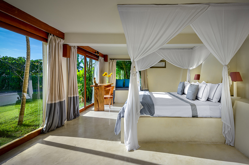 The fourth bedroom is also housed upstairs and offers 180-degree views of the ocean and rice fields. The room has a king size bed and an ensuite bathroom with a bathtub and shower.