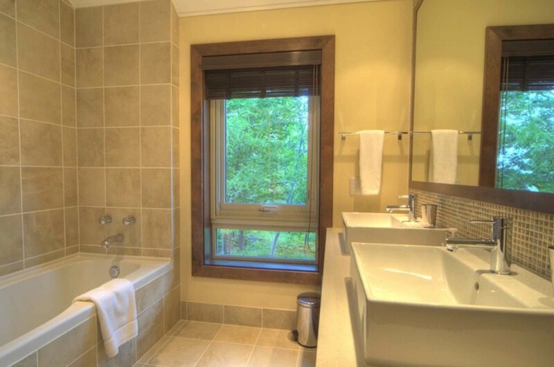 Located on the chalet’s second level, the second bedroom comes with a queen-sized bed and an ensuite bathroom with a shower.