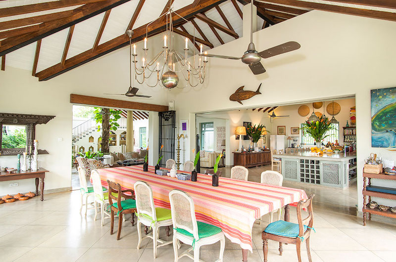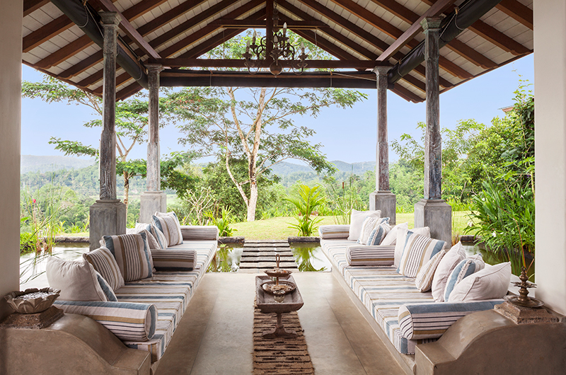 Sisindu Tea Estate’s dining area also has an open-sided layout, with a dining table able to set all 12 guests. To the back of the dining room is the villa’s fully fitted kitchen. Sisindu Tea Estate also has two outdoor dining areas.