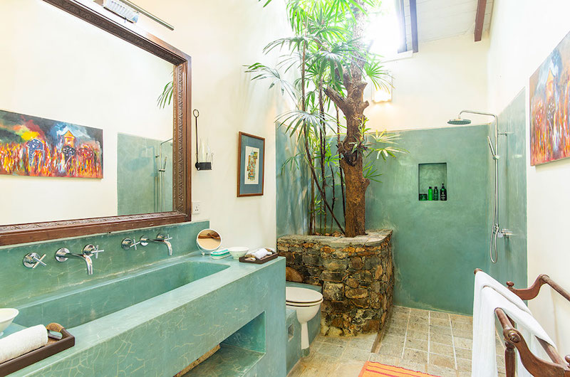 The master bedroom is located on the ground floor. This room has a king-sized four-poster bed, AC and an adjoining living room with a TV. The ensuite bathroom has a bathtub and double showers.