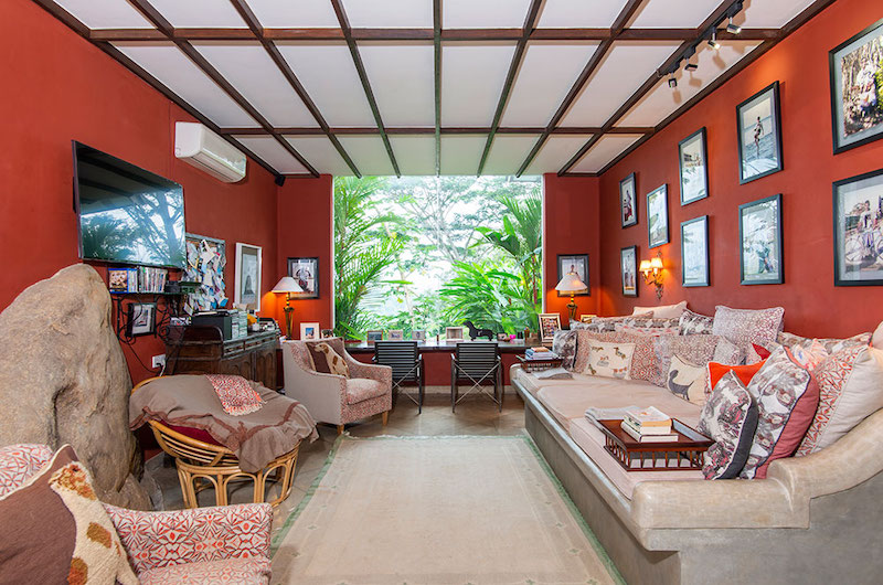 Sisindu Tea Estate’s living room is built around a tree which pierces through the airy room’s ceiling. The light-filled room is furnished with generous sofas and armchairs. The villa also has an air-conditioned TV room.