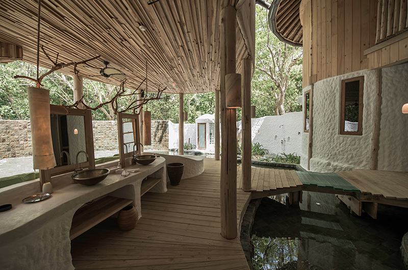 Soneva Fushi Villa 15 is hugged by a stunning lagoon pool with a private waterslide launching from the villa’s upper floor. The poolside terrace is lined with sun loungers and sofas, with a cool sunken lounge and a lazy hammock adding a delicious tropical twist.