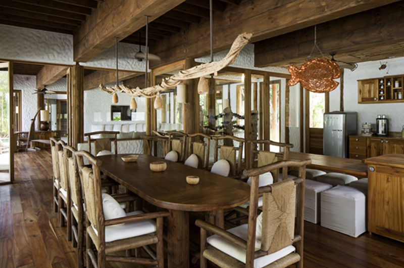 The dining room is housed next to the living room. The generous dining table can easily seat 10 guests. Soneva Fushi Villa 42 comes complete with a kitchen and wine cellar.