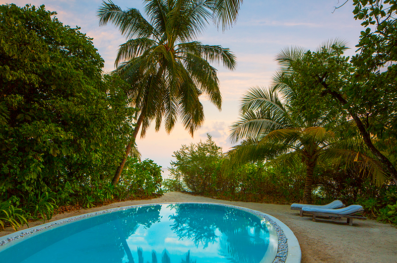 Soneva Fushi Villa 68’s beautiful lagoon pool sits perfectly positioned between the villa and the beach. The poolside area is dotted with sun loungers, with lounge seating available on the covered deck.
