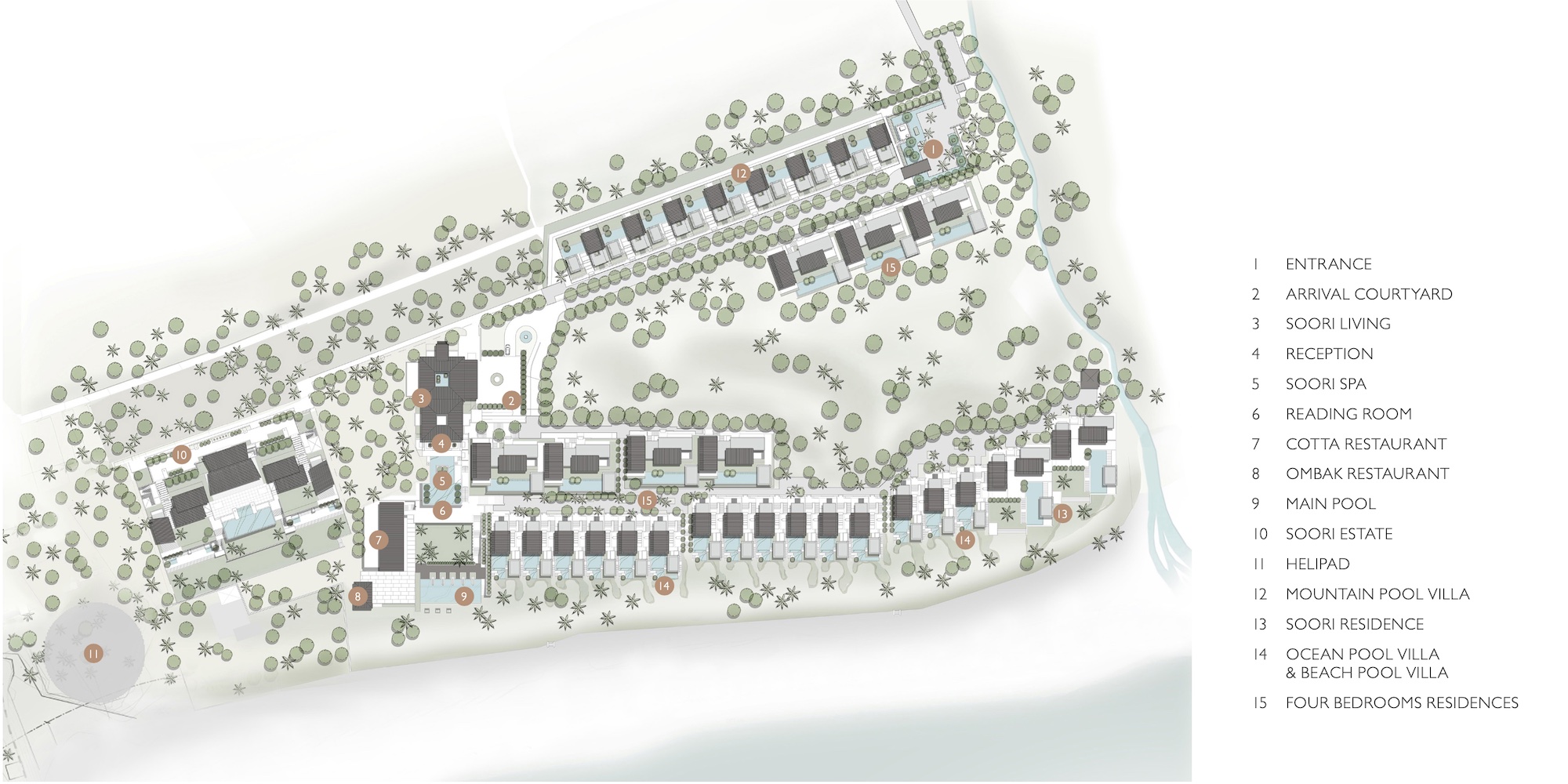 Soori Bali is a luxury villa resort housing 45 private villas. Mountain Pool Villas and Ocean Pool Villas have one bedroom each. Beach Pool Villas are available as one-bedroom or two-bedroom. The resort also houses three and four-bedroom Residences as well as the magnificent six-bedroom Soori Residence and the spectacular 10-bedroom Soori Estate.