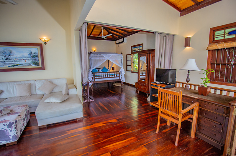 The villa’s open-plan veranda works as a relaxed alfresco living room and offers serene views of the pool and the lake glimmering beyond. The veranda is furnished with classic plantation chairs, perfect for relaxing with a cup of fine Ceylon tea while swapping stories from days spent exploring the island. The upper floor master bedroom includes a lounge area with a generous white sofa facing a satellite TV.