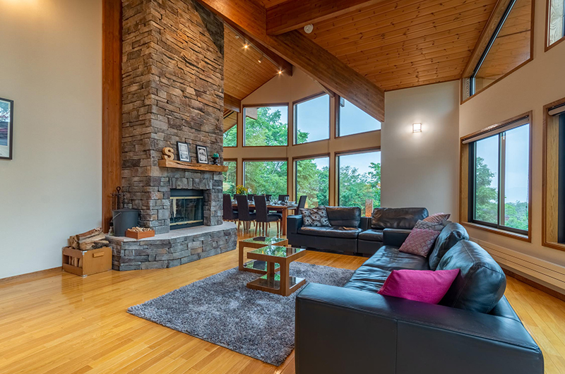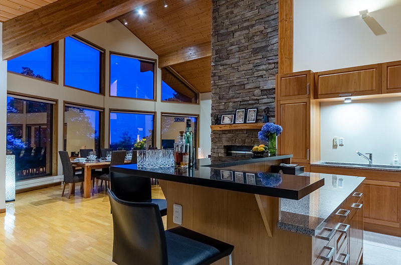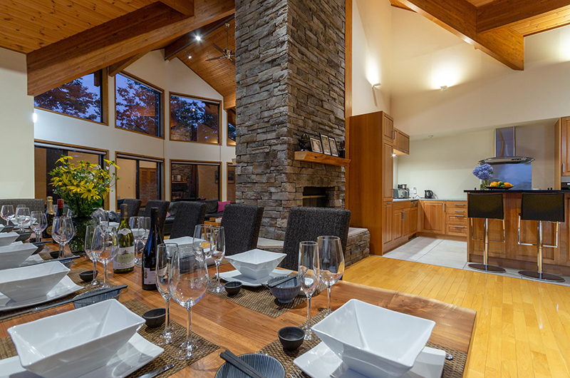 The dining room looks out to the snow-covered treetops and white carpet of fresh powder, from its full-wall glass oversized bay windows. Featuring a lengthy wooden dining table which comfortably seats 12 guests, this space blends together the living room, games room entertaining space and open-plan kitchen offering all modern appliances and additional seating on bar stools at the kitchen counter.