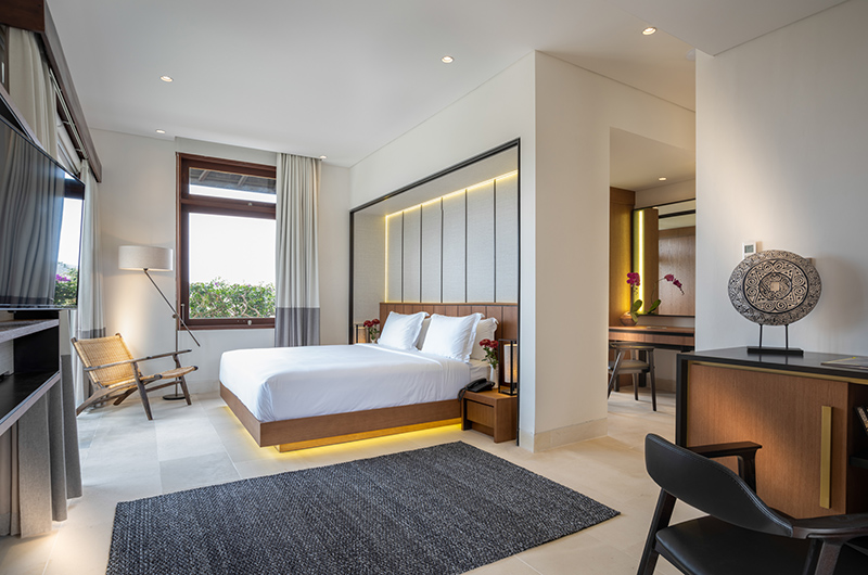 Villa Surga One is a six-bedroom villa accommodating up to 12 guests. The living and dining area are both housed within the same generous open plan space. The lavish dining table can seat up to eight people, while the rest of the party can relax on the plush sofa. Five of this massive estate’s ensuite bedrooms are housed within the villa, while the one remaining room is housed in a separate garden pavilion. The spacious rooms each feature Indonesian art and thoughtful antique touches, giving each of the rooms its own unique flavour. The villa’s two master bedrooms offer stunning, unhindered views overlooking the glimmering pool, reaching out into the ocean.