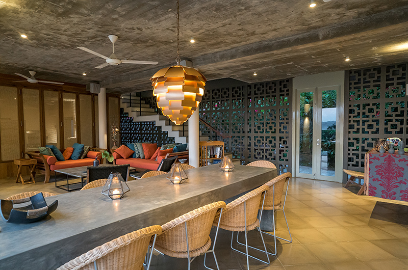 Sharing the same space with the living room, the dining table of polished cement is definitely the room’s WOW-factor. Seating up to 14 guests, the striking table is perched beneath a custom-made lantern with mesmerising vistas of the ocean working as the unforgettable backdrop of your every meal. The fluid space is adjoined by a fully-furnished kitchen. The kitchen is only available for staff to use.