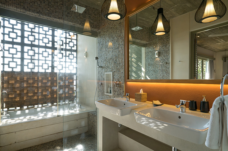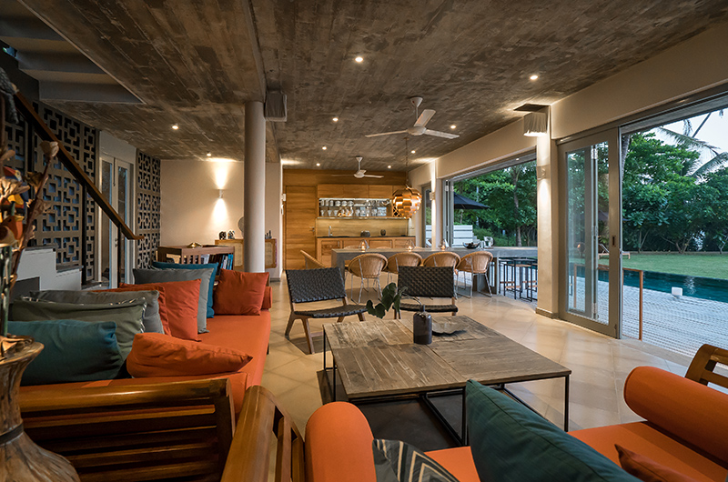 The living room can be used as a breezy open-plan lounge in true tropical style, with the massive infinity pool glimmering just outside. As the night continues, the rooms’ French doors can be closed for added privacy. The décor is a carefully curated mix of modern furniture and indigenous influences, complete with a hand-woven rattan screen alongside plush red sofas and a sleek teakwood bar.