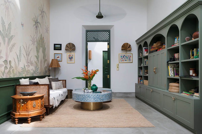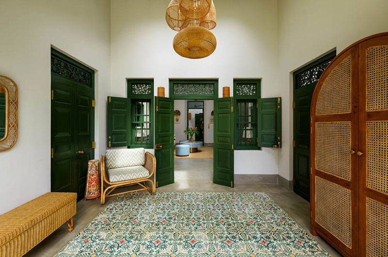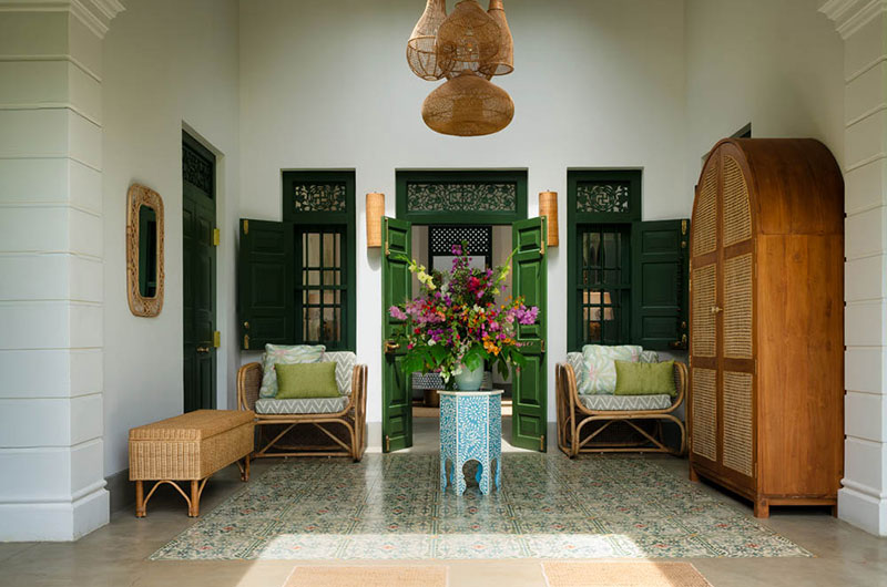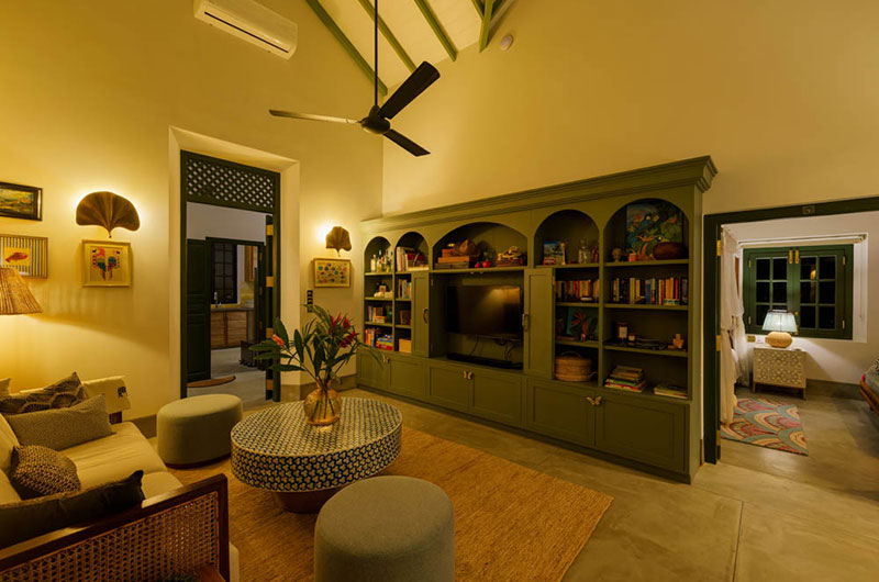 Life at the villa flows effortlessly between indoor and outdoor spaces. You can either relax on the rattan seats positioned outside on the veranda or head to the TV room housed inside. The indoor lounge features a plush sofa, beautiful round coffee table, and a sage green cabinet framing a large HD Apple TV.