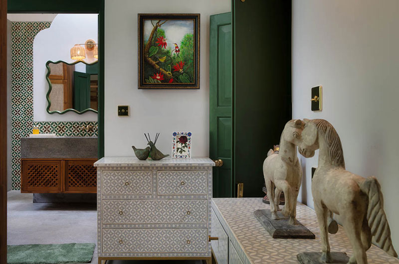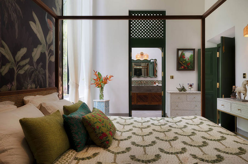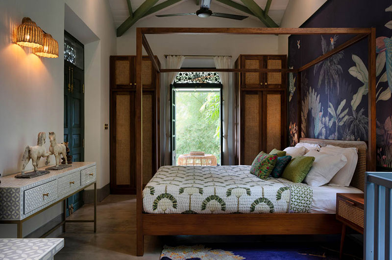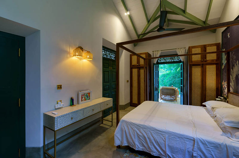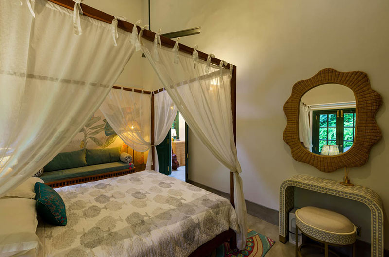 The first bedroom opens to a scenic terrace looking over the surrounding greenery. The bedroom itself boasts a four-poster bed, vanity desk, wardrobes, and a beautiful ensuite bathroom.
