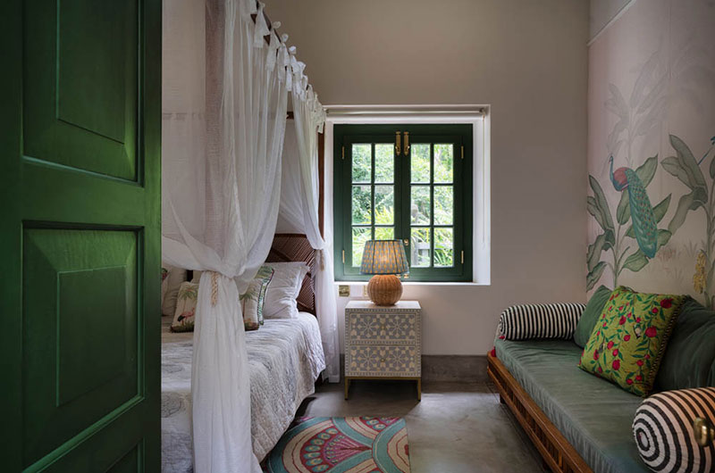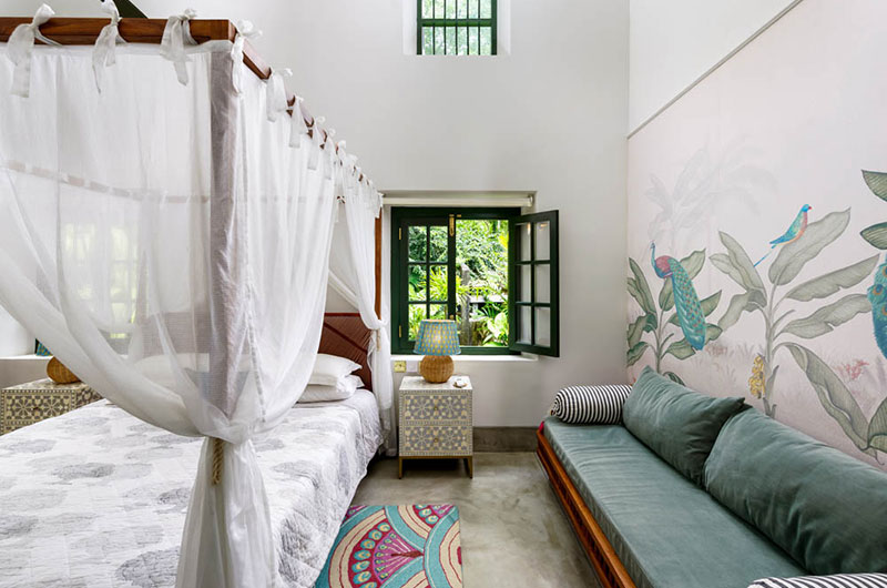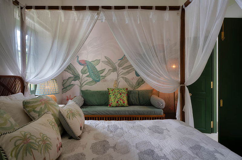 This room features a king-sized bed, daybed, and beautiful tropical murals. There is no ensuite bathroom, but there is a standalone bathroom close by.