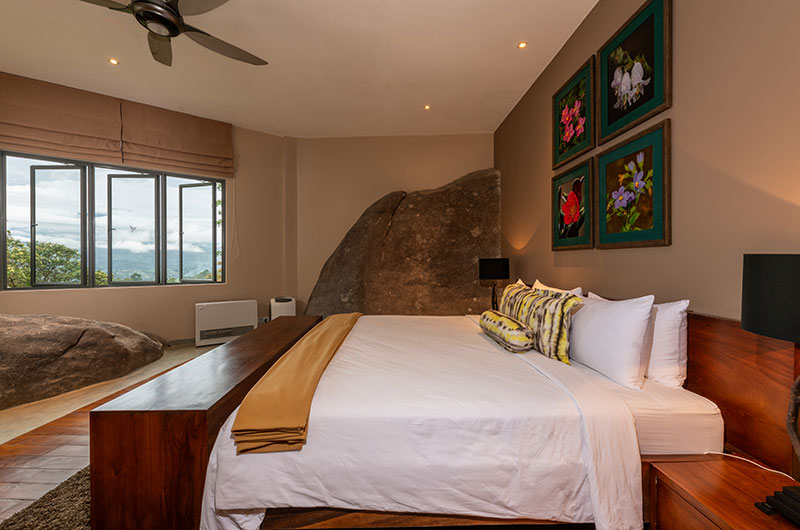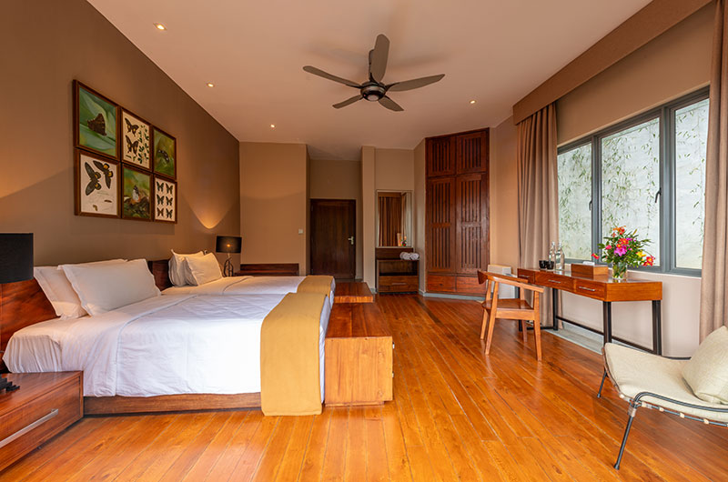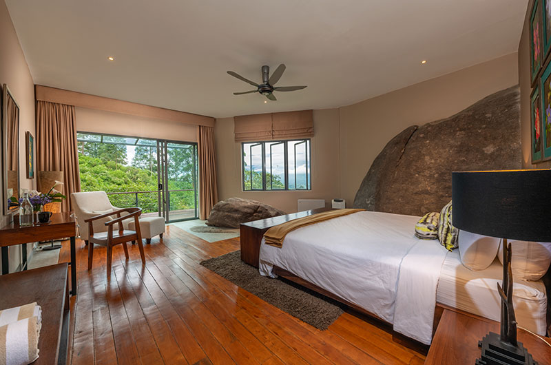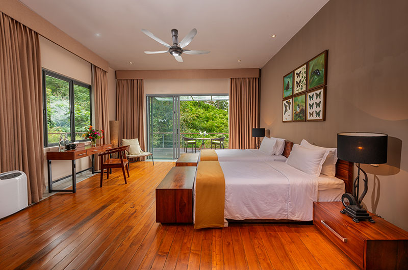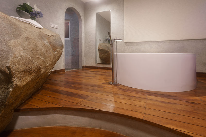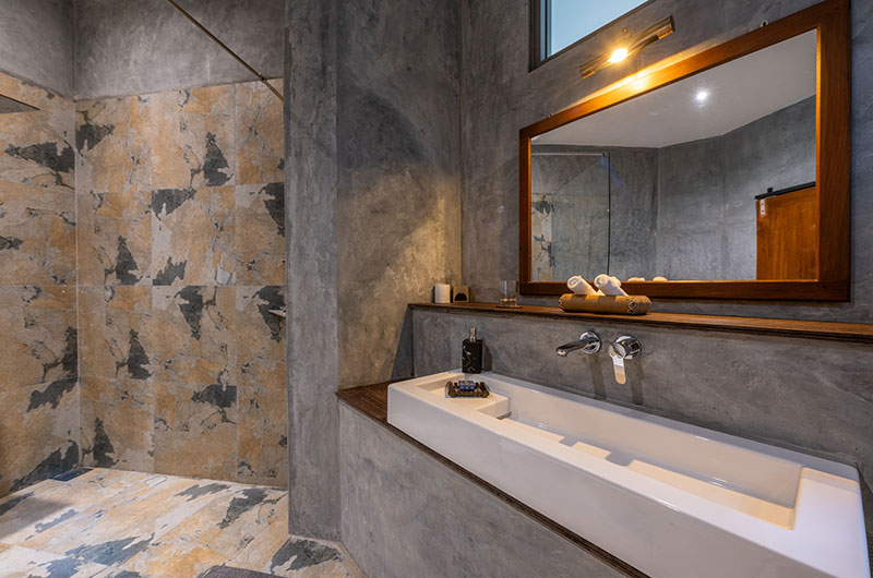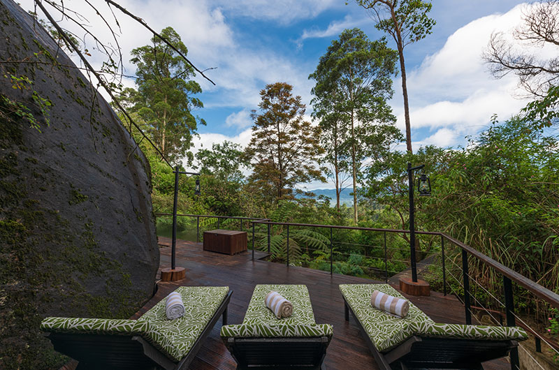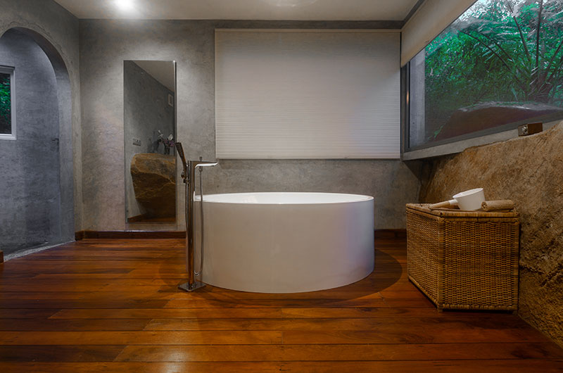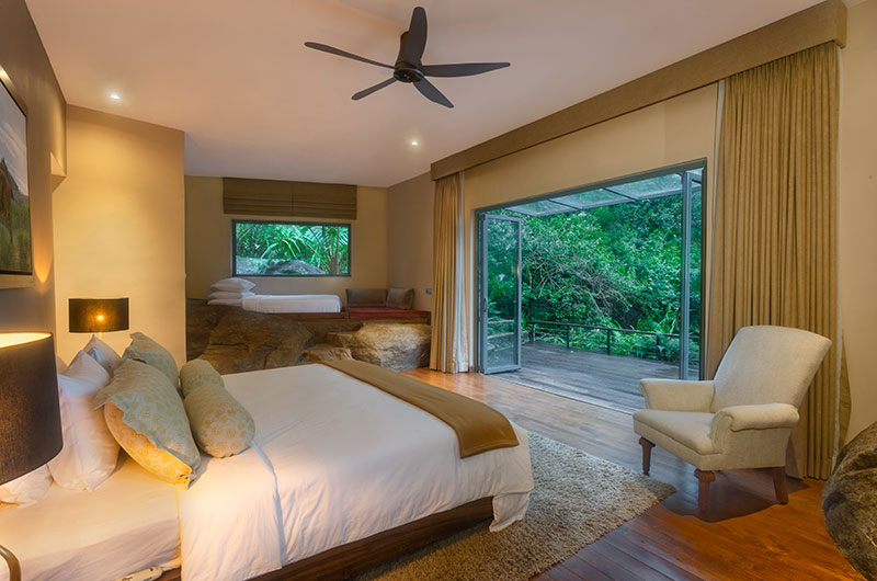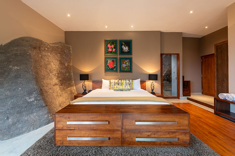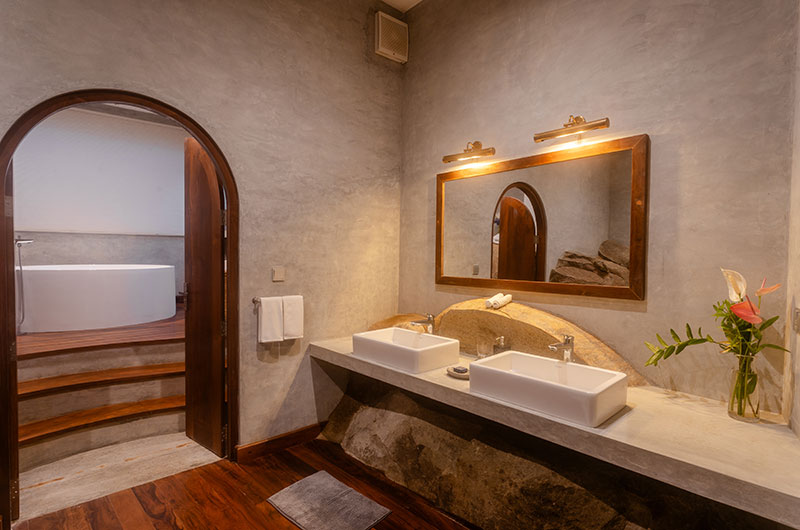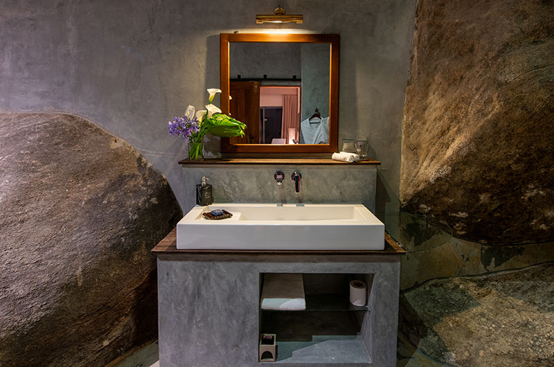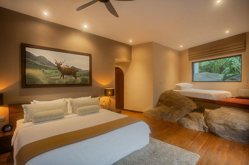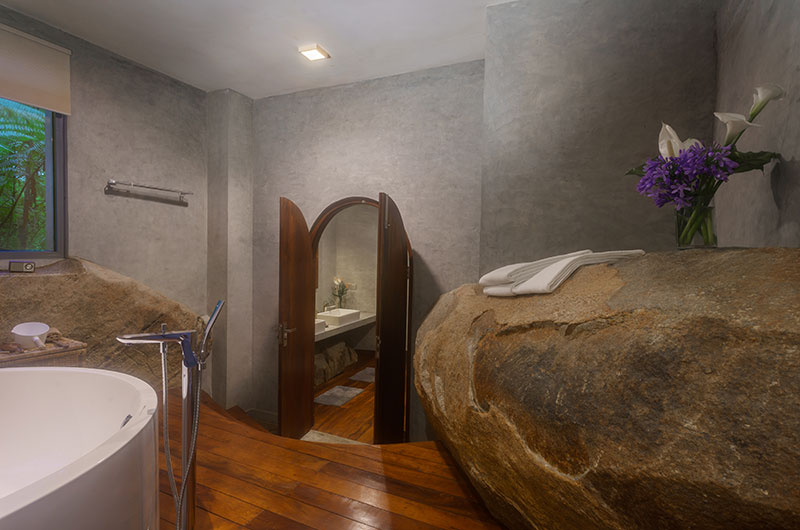The first bedroom is set within the cave and opens to a scenic balcony looking over the greenery. The room features a king-sized bed, occasional chair, and work desk. There’s also an extra single bed positioned on an elevated platform – a great setup for families looking to share a room. The ensuite bathroom features a gorgeous circular bathtub, rain shower, dual sinks, and a toilet.