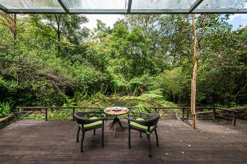 This room also benefits from a scenic balcony gazing over the greenery. The room features a queen-sized bed, cosy armchair, and a work desk. Built into the natural cave, the ensuite bathroom features a rain shower, spacious vanity, and a toilet.