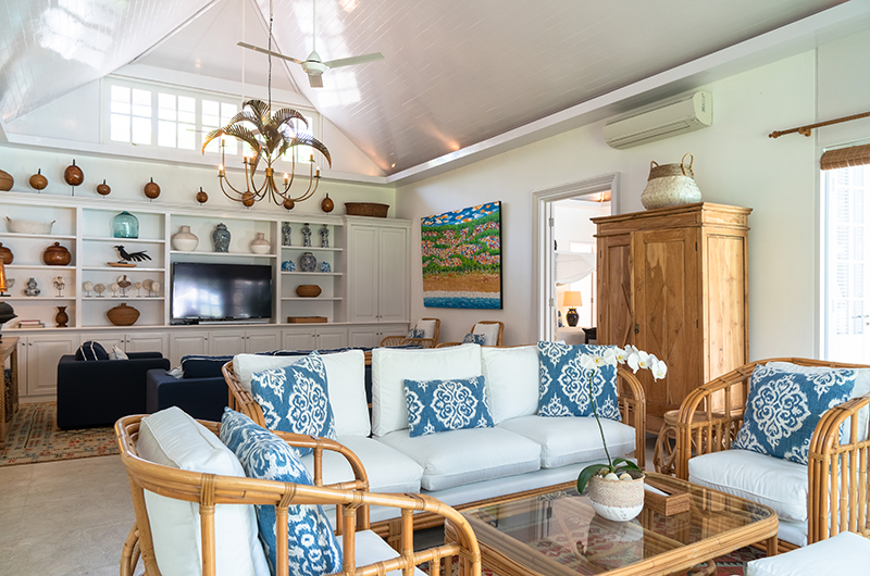 Thanks to the villa’s generous layout, The Cotton House includes three separate living areas divided into their own pavilions. The first one is located in the main building and houses generous seating, a TV and a pool table. Another lounge is housed in the pavilion housing five bedrooms and a third one adjoins the fourth pavilion which includes two more bedrooms.