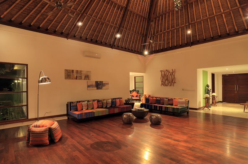 The Jiva’s living room is housed in the main building and features a sky-high alang-alang ceiling. The room includes generous sofas and is decorated with Indonesian art.