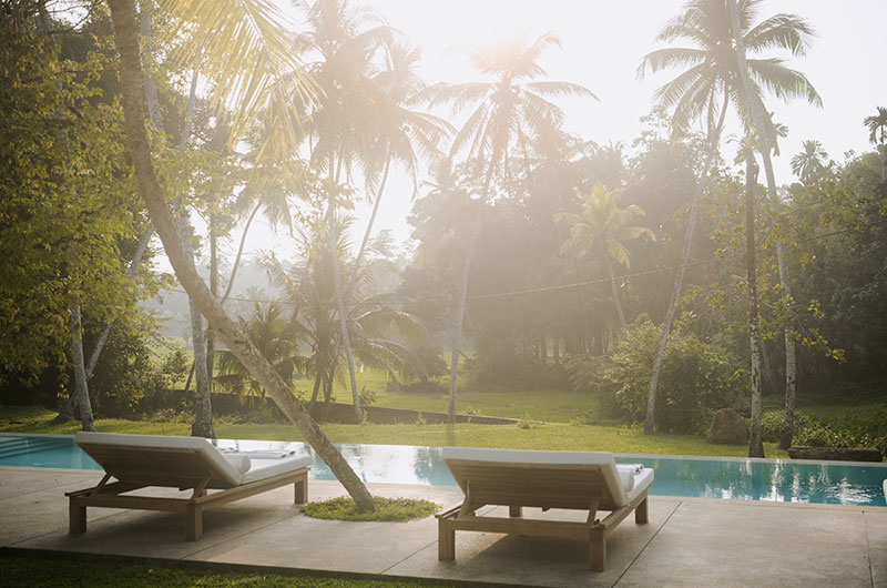 The villa’s surroundings are absolutely magical, with dreamy palm trees arching over picturesque paddy fields. In fact, the estate once housed a cinnamon plantation and is now home to a thriving orchard where you can spot jackfruit, mangoes, coconuts, and other tropical fruit hanging off the branches. A 17-metre-long pool dazzles at the centre of the garden, inviting guests in for a refreshing dip amid all that gorgeous greenery. The pool also features a shallow section that’s ideal for children. Double sun beds framing the pool invite guests to perfect that golden holiday tan.