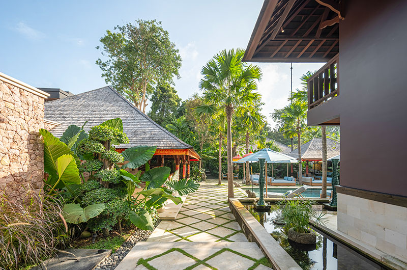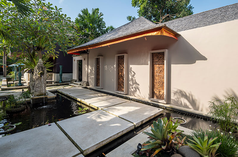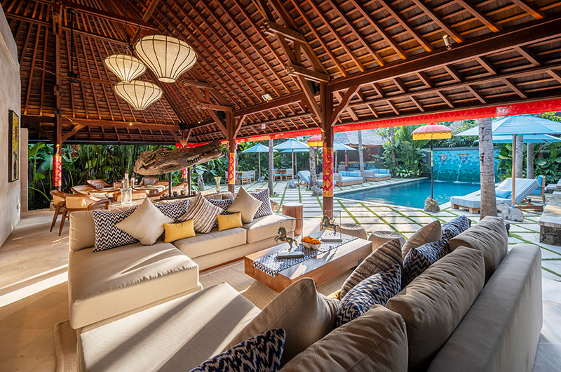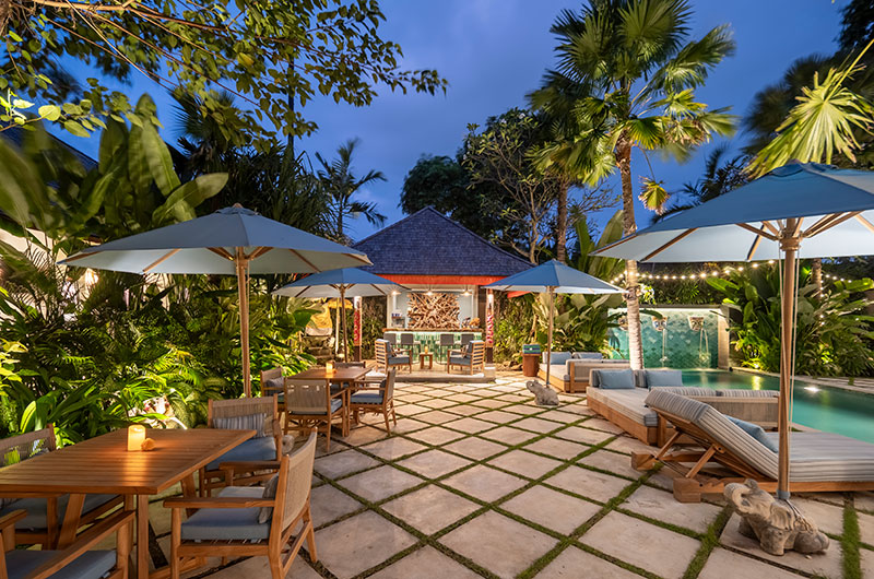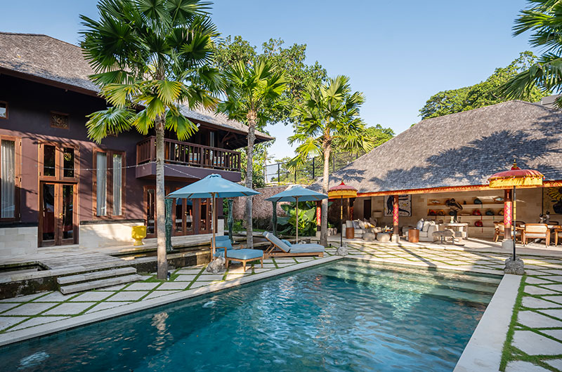 There’s so much lovely outdoor space to enjoy at this beautiful Balinese villa. A large blue swimming pool dazzles at the centre of the property, with sun beds and parasols offering a choice between sun and shade. There’s even a swanky bar area to help get the good times started. The open sided living areas blend seamlessly with the outdoor areas, while the pathways connecting the pavilions introduce a wonderful sense of mystery. All of this is framed by tropical greenery and colourful flowers – it’s the definition of Balinese paradise.
